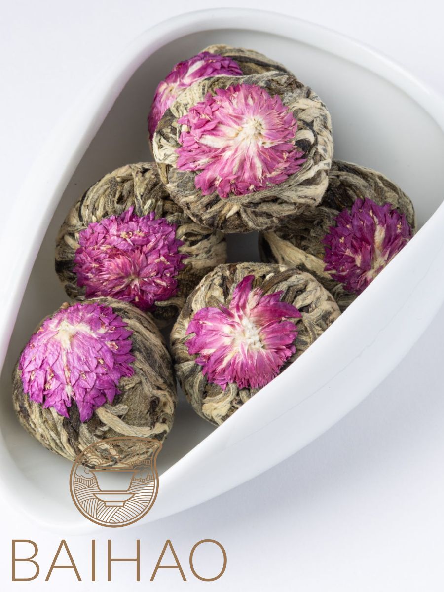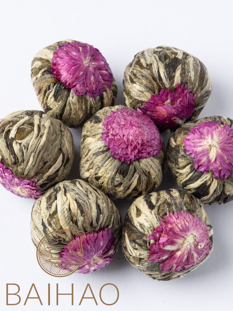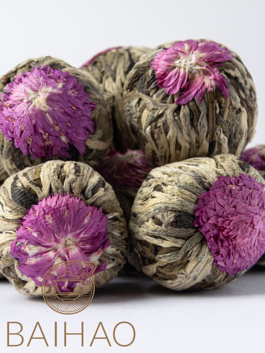 Классический зелёный чай высокого качества, связанный в распускающийся цветок с личи внутри.